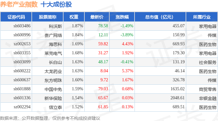 证券之星消息,11月28日,养老产业(399812)指数报收于6412.21点,涨0.4%,成交261.34亿元,换手率0.68%。当日该指数成份股中,上涨的有45家,太龙药业以5.37%的涨幅领涨,下跌的有32家,贵广网络以3.89%的跌幅领跌。