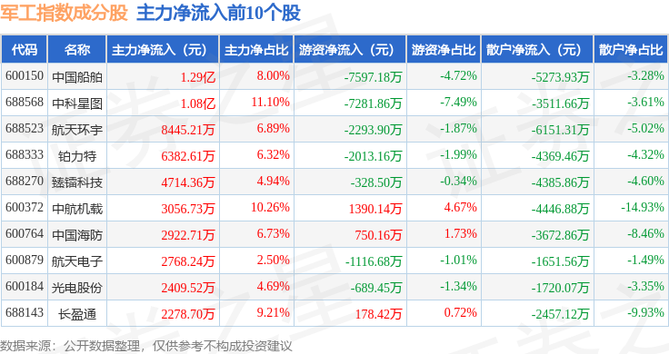 资金流向方面,军工指数(399959)成份股当日主力资金净流入合计1.82亿元,游资资金净流出合计1855.68万元,散户资金净流出合计1.63亿元。成份股资金流向详情见下表: