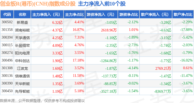 资金流向方面,创业板R(港币)(CNH)(470006)指数成份股当日主力资金净流出合计2.07亿元,游资资金净流入合计1.63亿元,散户资金净流入合计4428.22万元。成份股资金流向详情见下表: