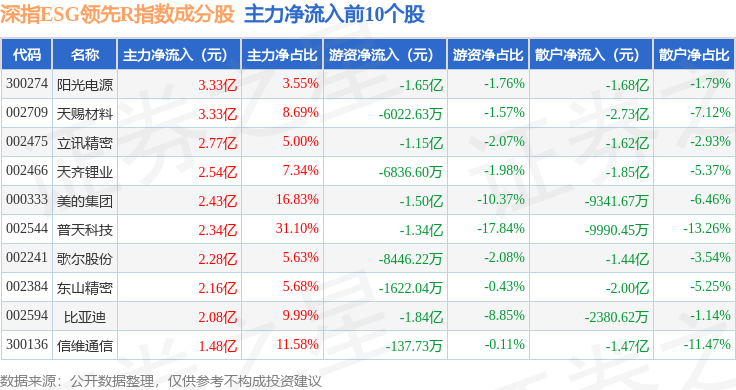 资金流向方面,深指ESG领先R(470029)指数成份股当日主力资金净流出合计8.38亿元,游资资金净流入合计2.4亿元,散户资金净流入合计5.98亿元。成份股资金流向详情见下表: