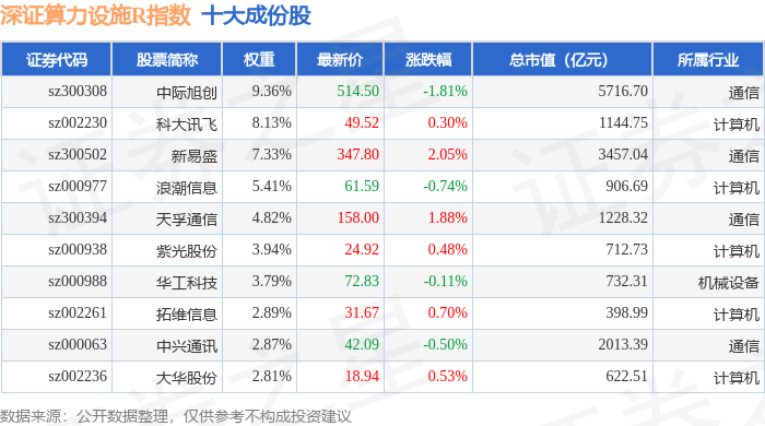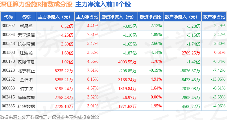 资金流向方面,深证算力设施R(470051)指数成份股当日主力资金净流出合计9.9亿元,游资资金净流入合计1.29亿元,散户资金净流入合计8.61亿元。成份股资金流向详情见下表:
