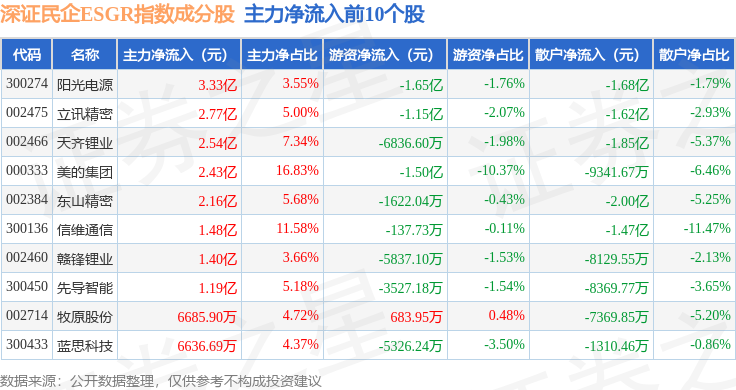 资金流向方面,深证民企ESGR(470056)指数成份股当日主力资金净流入合计9603.9万元,游资资金净流出合计2.31亿元,散户资金净流入合计1.35亿元。成份股资金流向详情见下表: