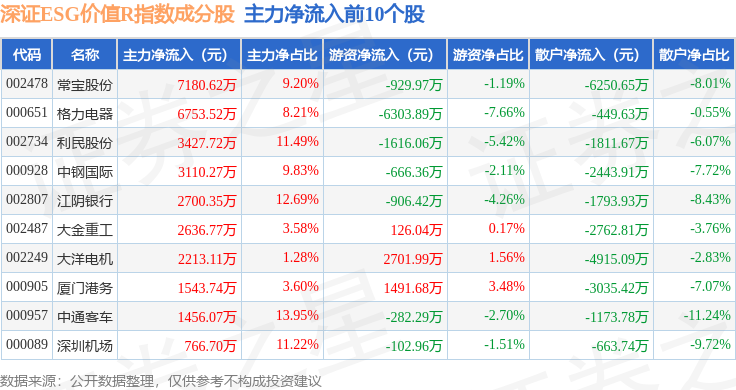 资金流向方面,深证ESG价值R(470061)指数成份股当日主力资金净流出合计3.76亿元,游资资金净流入合计5616.96万元,散户资金净流入合计3.2亿元。成份股资金流向详情见下表: