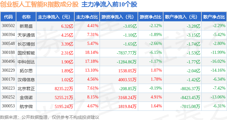 资金流向方面,创业板人工智能R(470070)指数成份股当日主力资金净流出合计4.17亿元,游资资金净流入合计3.86亿元,散户资金净流入合计3085.11万元。成份股资金流向详情见下表: