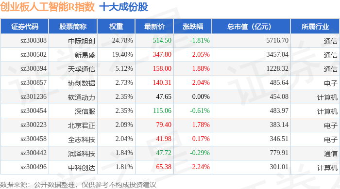 创业板人工智能R(470070)指数十大成份股详情如下: