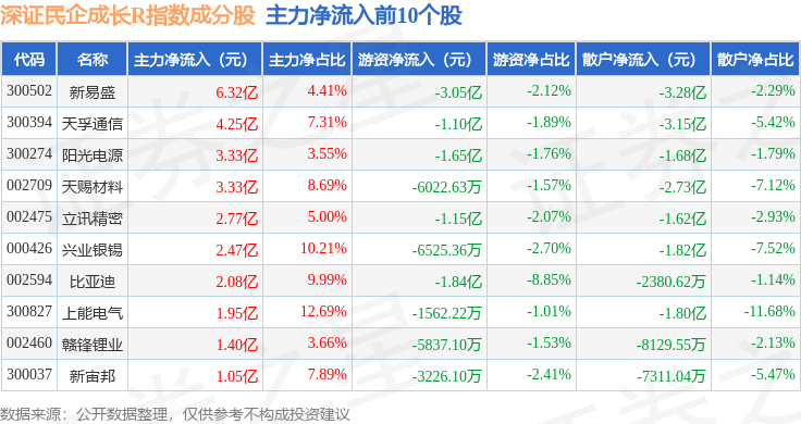 资金流向方面,深证民企成长R(470071)指数成份股当日主力资金净流入合计13.23亿元,游资资金净流入合计909.67万元,散户资金净流出合计13.32亿元。成份股资金流向详情见下表: