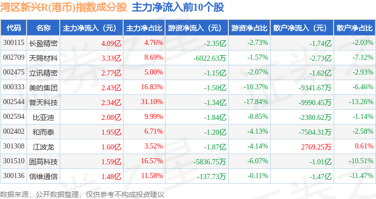 资金流向方面,湾区新兴R(港币)(480008)指数成份股当日主力资金净流入合计1.96亿元,游资资金净流出合计12.66亿元,散户资金净流入合计10.71亿元。成份股资金流向详情见下表: