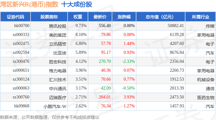 湾区新兴R(港币)(480008)指数十大成份股详情如下: