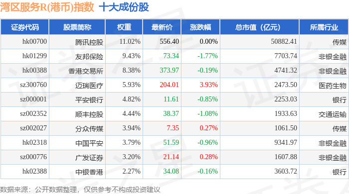 湾区服务R(港币)(480012)指数十大成份股详情如下: