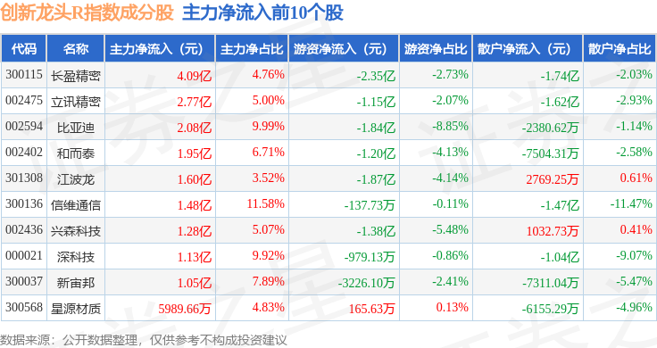 资金流向方面,创新龙头R(480036)指数成份股当日主力资金净流入合计4.01亿元,游资资金净流出合计9.44亿元,散户资金净流入合计5.43亿元。成份股资金流向详情见下表: