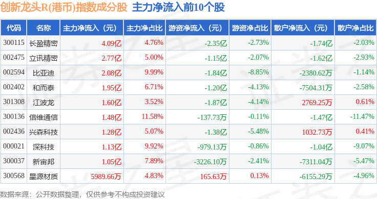 资金流向方面,创新龙头R(港币)(480037)指数成份股当日主力资金净流入合计4.01亿元,游资资金净流出合计9.44亿元,散户资金净流入合计5.43亿元。成份股资金流向详情见下表: