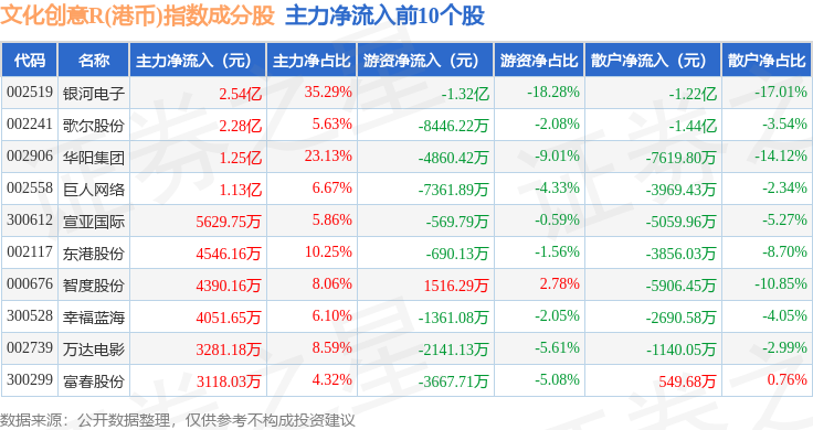 资金流向方面,文化创意R(港币)(480047)指数成份股当日主力资金净流出合计4.46亿元,游资资金净流入合计1.05亿元,散户资金净流入合计3.41亿元。成份股资金流向详情见下表: