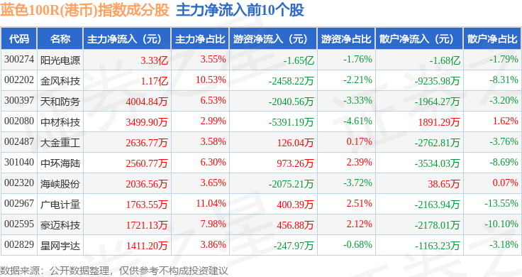 资金流向方面,蓝色100R(港币)(480069)指数成份股当日主力资金净流入合计4.71亿元,游资资金净流出合计2.61亿元,散户资金净流出合计2.1亿元。成份股资金流向详情见下表: