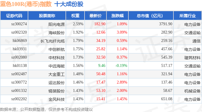 蓝色100R(港币)(480069)指数十大成份股详情如下: