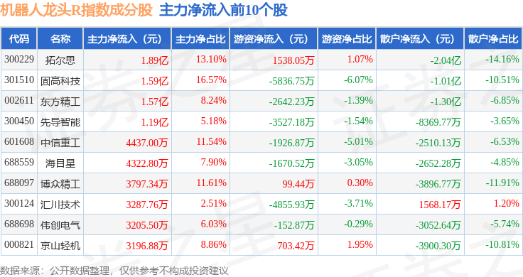 资金流向方面,机器人龙头R(480071)指数成份股当日主力资金净流入合计4.3亿元,游资资金净流出合计1.84亿元,散户资金净流出合计2.47亿元。成份股资金流向详情见下表: