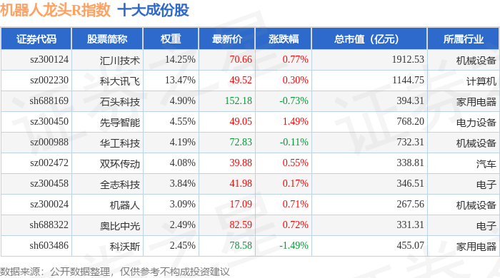 证券之星消息,11月28日,机器人龙头R(480071)指数报收于2532.15点,涨0.87%,成交246.17亿元,换手率1.96%。当日该指数成份股中,上涨的有44家,固高科技以14.24%的涨幅领涨,下跌的有5家,凌云光以1.88%的跌幅领跌。
