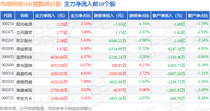 资金流向方面,内地科技50R(483003)指数成份股当日主力资金净流出合计3.12亿元,游资资金净流出合计1.29亿元,散户资金净流入合计4.41亿元。成份股资金流向详情见下表: