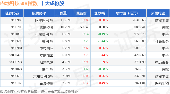 证券之星消息,11月28日,内地科技50R(483003)指数报收于3328.55点,涨0.36%,成交739.2亿元,换手率0.69%。当日该指数成份股中,上涨的有29家,迈瑞医疗以3.93%的涨幅领涨,下跌的有19家,阿里健康以3.3%的跌幅领跌。