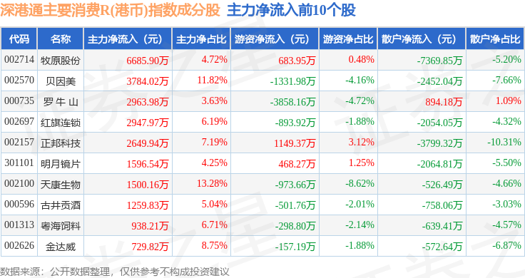 资金流向方面,深港通主要消费R(港币)(483022)指数成份股当日主力资金净流出合计1.61亿元,游资资金净流出合计7645.77万元,散户资金净流入合计2.38亿元。成份股资金流向详情见下表:
