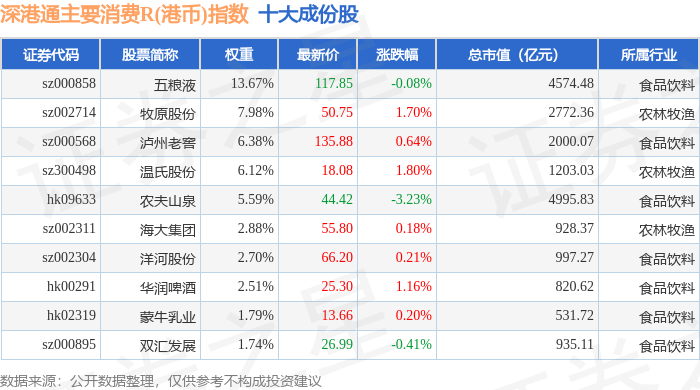 深港通主要消费R(港币)(483022)指数十大成份股详情如下: