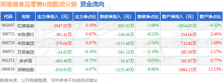 资金流向方面,深港通食品零售R(483037)指数成份股当日主力资金净流入合计2549.98万元,游资资金净流出合计4356.49万元,散户资金净流入合计1806.51万元。成份股资金流向详情见下表:
