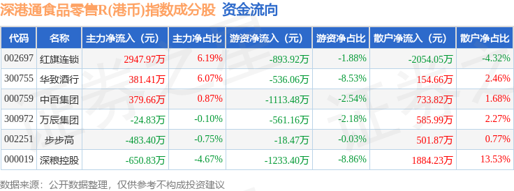 资金流向方面,深港通食品零售R(港币)(483038)指数成份股当日主力资金净流入合计2549.98万元,游资资金净流出合计4356.49万元,散户资金净流入合计1806.51万元。成份股资金流向详情见下表: