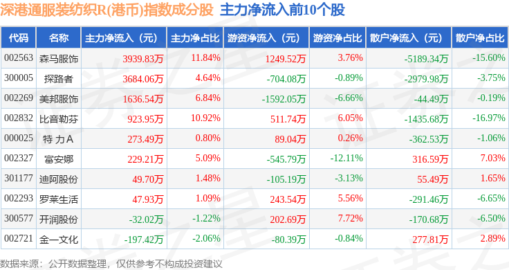 资金流向方面,深港通服装纺织R(港币)(483042)指数成份股当日主力资金净流入合计1982.27万元,游资资金净流出合计4207.05万元,散户资金净流入合计2224.79万元。成份股资金流向详情见下表: