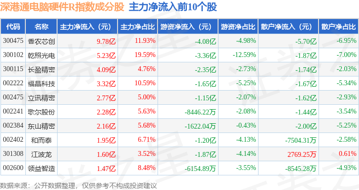 资金流向方面,深港通电脑硬件R(483043)指数成份股当日主力资金净流入合计20.58亿元,游资资金净流出合计21.03亿元,散户资金净流入合计4420.12万元。成份股资金流向详情见下表: