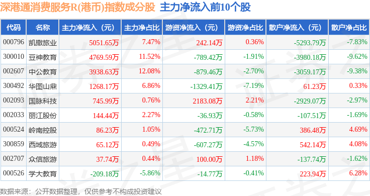 资金流向方面,深港通消费服务R(港币)(483046)指数成份股当日主力资金净流入合计5493.98万元,游资资金净流出合计1684.6万元,散户资金净流出合计3809.38万元。成份股资金流向详情见下表: