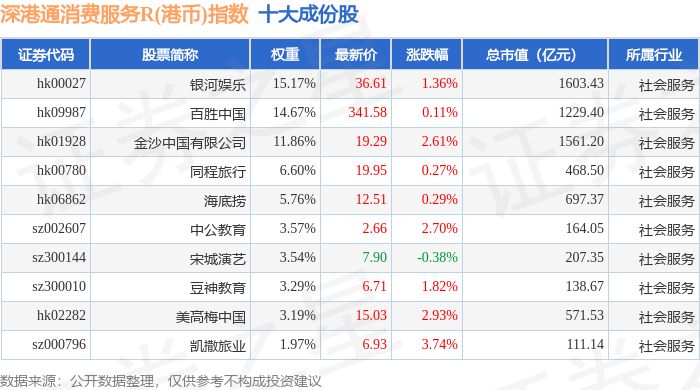 深港通消费服务R(港币)(483046)指数十大成份股详情如下: