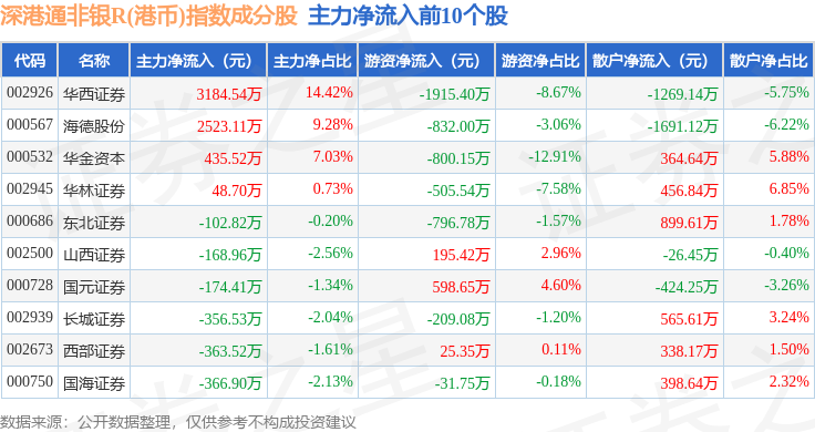 资金流向方面,深港通非银R(港币)(483054)指数成份股当日主力资金净流出合计5.38亿元,游资资金净流入合计6589.67万元,散户资金净流入合计4.72亿元。成份股资金流向详情见下表: