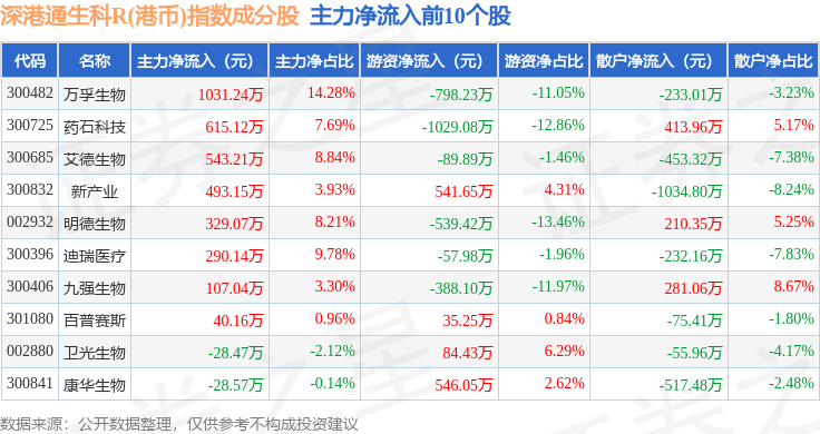 资金流向方面,深港通生科R(港币)(483060)指数成份股当日主力资金净流出合计2.74亿元,游资资金净流入合计1.08亿元,散户资金净流入合计1.67亿元。成份股资金流向详情见下表: