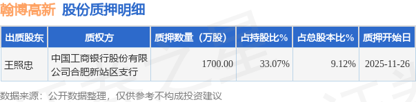 证券之星消息,翰博高新(301321)11月28日公开信息显示,股东王照忠向中国工商银行股份有限公司合肥新站区支行合计质押1700.0万股,占总股本9.12%。质押详情见下表:
