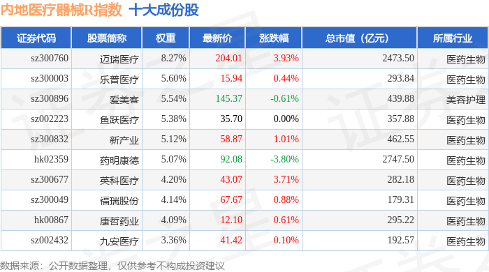 内地医疗器械R(483103)指数十大成份股详情如下: