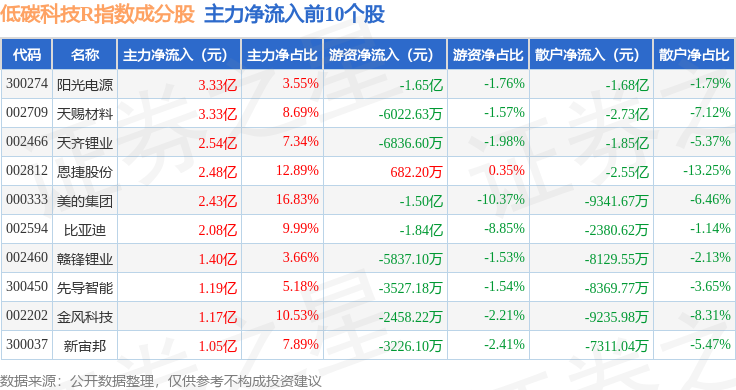 资金流向方面,低碳科技R(483160)指数成份股当日主力资金净流入合计11.98亿元,游资资金净流出合计1.96亿元,散户资金净流出合计10.02亿元。成份股资金流向详情见下表: