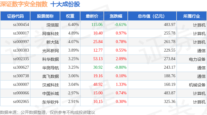 证券之星消息,11月28日,深证数字安全(970052)指数报收于3396.41点,涨1.22%,成交170.28亿元,换手率2.37%。当日该指数成份股中,上涨的有46家,国投智能以7.45%的涨幅领涨,下跌的有4家,华测导航以0.8%的跌幅领跌。