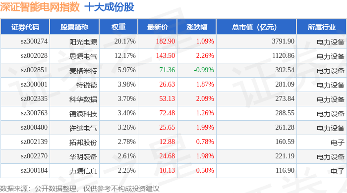 证券之星消息,11月28日,深证智能电网(970054)指数报收于3843.97点,涨1.53%,成交246.16亿元,换手率2.65%。当日该指数成份股中,上涨的有46家,金智科技以10.04%的涨幅领涨,下跌的有4家,英杰电气以4.98%的跌幅领跌。