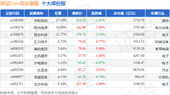 深证ESG成长(970060)指数十大成份股详情如下: