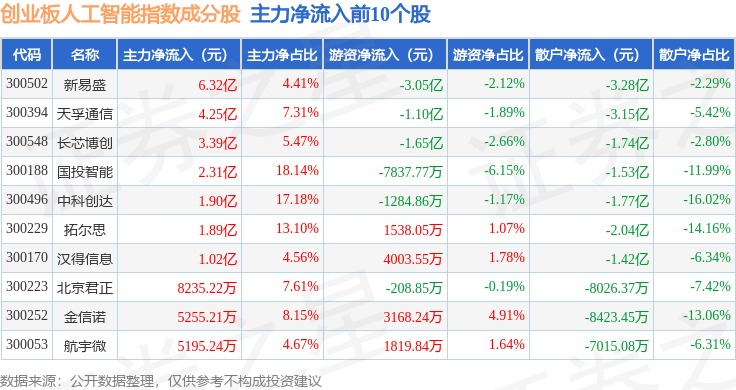 资金流向方面,创业板人工智能(970070)指数成份股当日主力资金净流出合计4.17亿元,游资资金净流入合计3.86亿元,散户资金净流入合计3085.11万元。成份股资金流向详情见下表: