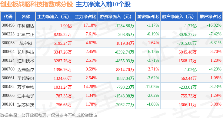 资金流向方面,创业板战略科技(971004)指数成份股当日主力资金净流出合计6.9亿元,游资资金净流入合计244.45万元,散户资金净流入合计6.88亿元。成份股资金流向详情见下表: