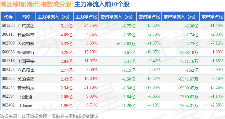 资金流向方面,湾区综指(港币)(980004)指数成份股当日主力资金净流入合计11.9亿元,游资资金净流出合计26.38亿元,散户资金净流入合计14.43亿元。成份股资金流向详情见下表: