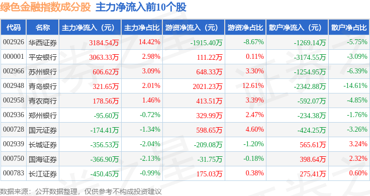 资金流向方面,绿色金融(980052)指数成份股当日主力资金净流出合计6.44亿元,游资资金净流入合计2.88亿元,散户资金净流入合计3.55亿元。成份股资金流向详情见下表: