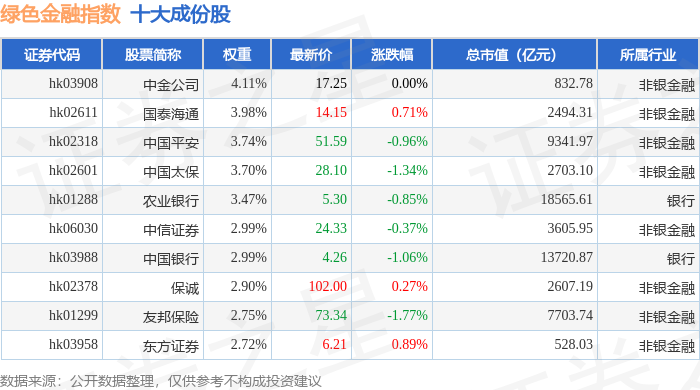 证券之星消息,11月28日,绿色金融(980052)指数报收于2063.38点,跌0.51%,成交212.46亿元,换手率0.21%。当日该指数成份股中,上涨的有22家,渣打集团以1.73%的涨幅领涨,下跌的有24家,中国人民保险集团以3.03%的跌幅领跌。