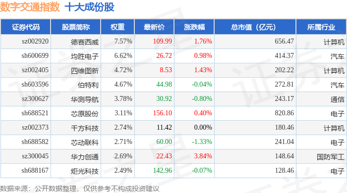 证券之星消息,11月28日,数字交通(980075)指数报收于3094.01点,涨1.15%,成交234.92亿元,换手率1.87%。当日该指数成份股中,上涨的有39家,华阳集团以6.93%的涨幅领涨,下跌的有9家,盛视科技以1.96%的跌幅领跌。