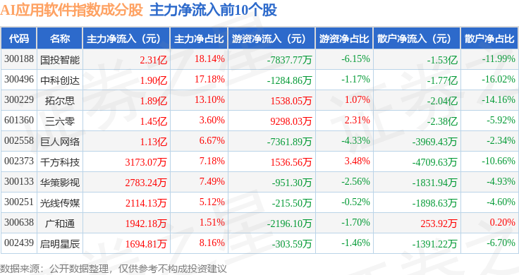 资金流向方面,AI应用软件(980107)指数成份股当日主力资金净流出合计2.31亿元,游资资金净流入合计2.81亿元,散户资金净流出合计5037.01万元。成份股资金流向详情见下表: