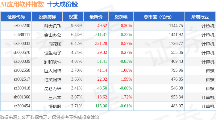 AI应用软件(980107)指数十大成份股详情如下: