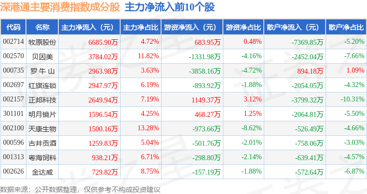 资金流向方面,深港通主要消费(983021)指数成份股当日主力资金净流出合计1.61亿元,游资资金净流出合计7645.77万元,散户资金净流入合计2.38亿元。成份股资金流向详情见下表: