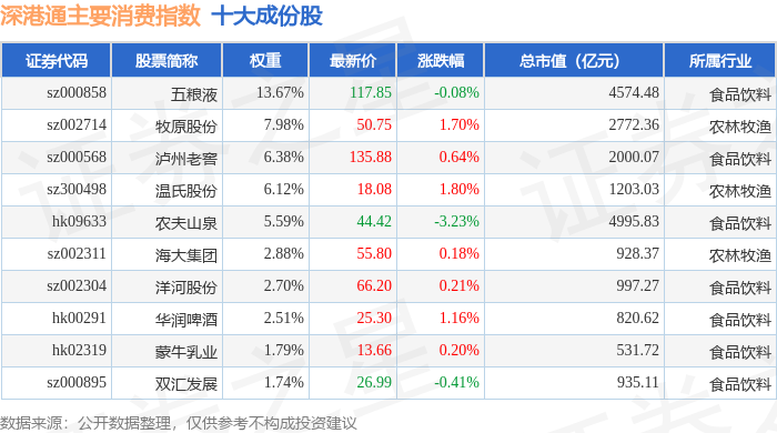 证券之星消息,11月28日,深港通主要消费(983021)指数报收于5827.72点,涨0.29%,成交188.63亿元,换手率0.72%。当日该指数成份股中,上涨的有81家,优然牧业以6.6%的涨幅领涨,下跌的有36家,农夫山泉以3.23%的跌幅领跌。