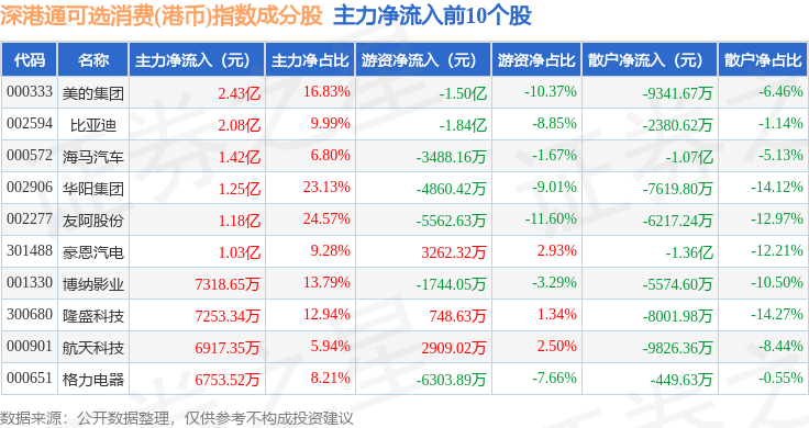 资金流向方面,深港通可选消费(港币)(983020)指数成份股当日主力资金净流入合计1.03亿元,游资资金净流出合计4.44亿元,散户资金净流入合计3.41亿元。成份股资金流向详情见下表:
