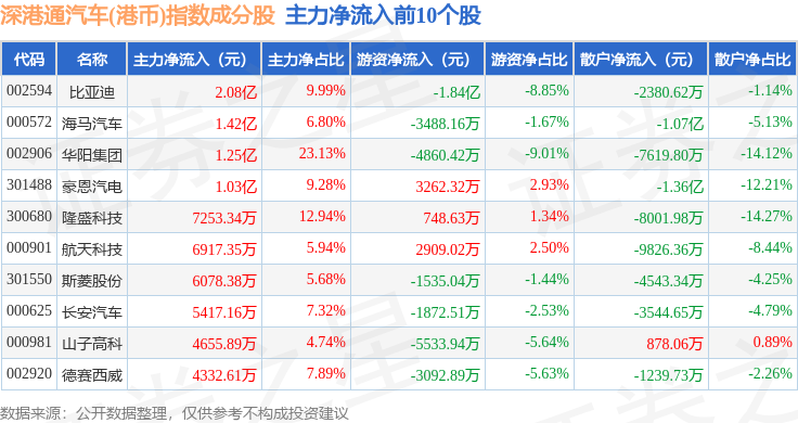 资金流向方面,深港通汽车(港币)(983040)指数成份股当日主力资金净流入合计6.76亿元,游资资金净流出合计3.06亿元,散户资金净流出合计3.7亿元。成份股资金流向详情见下表: